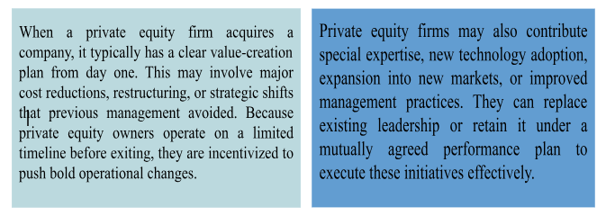 Private equity is a way for investors to put their money into companies that need support to grow or recover. A private equity firm first raises money from high-net-worth individuals and other investors, and creates a fund. This fund is then used to invest in companies that have strong potential or are struggling financially but can improve with the right support. Once the investment is made, the company receives the capital it needs—either to fix financial issues, expand its operations, enter new markets, or simply manage day-to-day activities. Private equity investors usually do not manage the business directly. Instead, they guide the company by offering strategic advice, industry knowledge, and connections that can help it perform better.